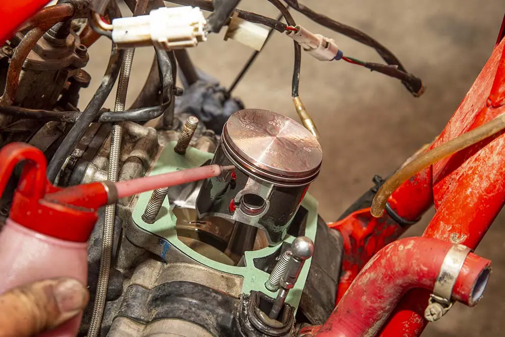 新しいガスケットを入れて、ピストン全体とガスケットに2ストオイルを塗布したらいよいよシリンダーを入れていきます。シリンダーを外した時と同じくピストンを下げてから作業を始めましょう。