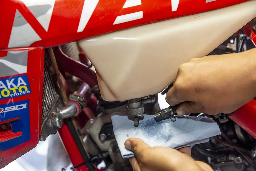 最初にタンクを下ろすため、燃料タンクのコックをオフにしてキャブレーターに繋がるホースを外します。