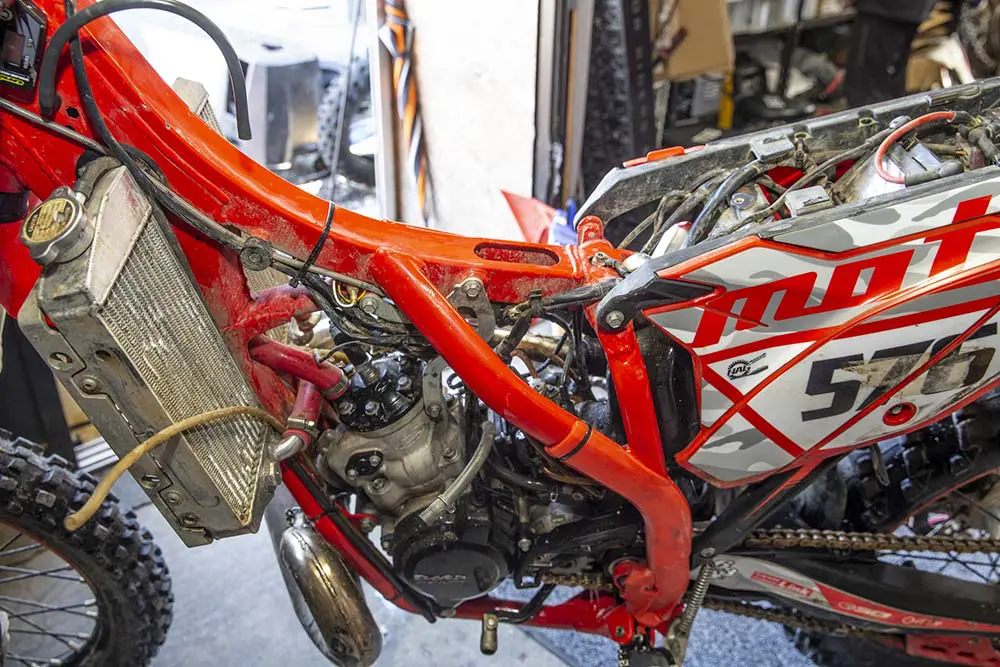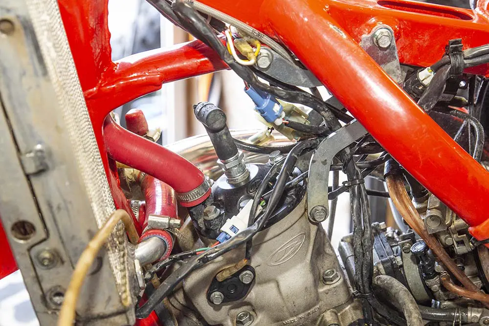 フレームを綺麗にするのはもちろん、ハーネスをまとめているタイラップなども外して一本一本拭き上げ、汚れを落としていきます。なぜかというと、ハーネスとハーネスの間にはよく砂が挟まっていて、シリンダーを開けてる時にそれが落ちてエンジン内部に入り込むと大変なことになってしまうからです。