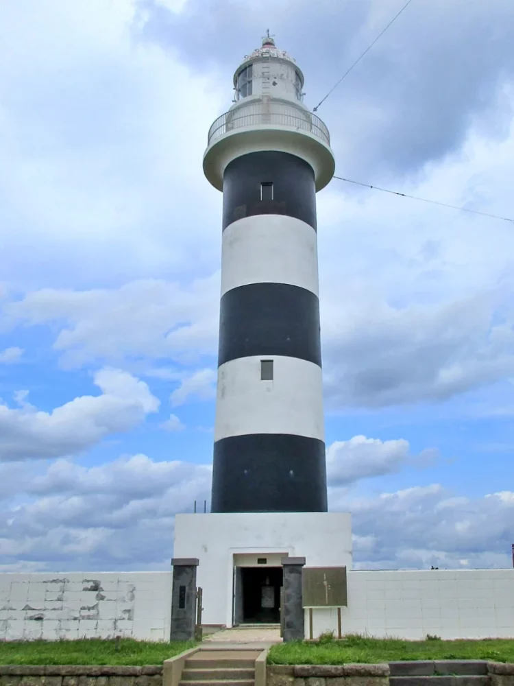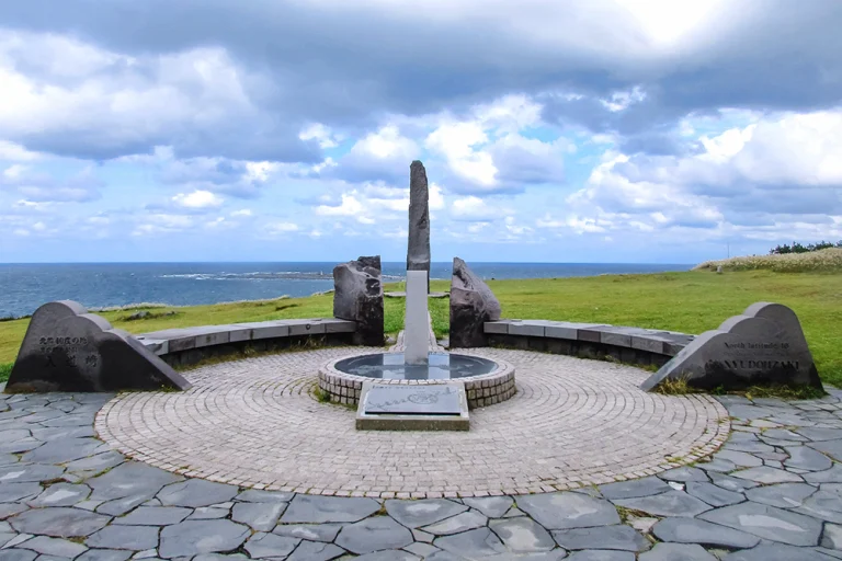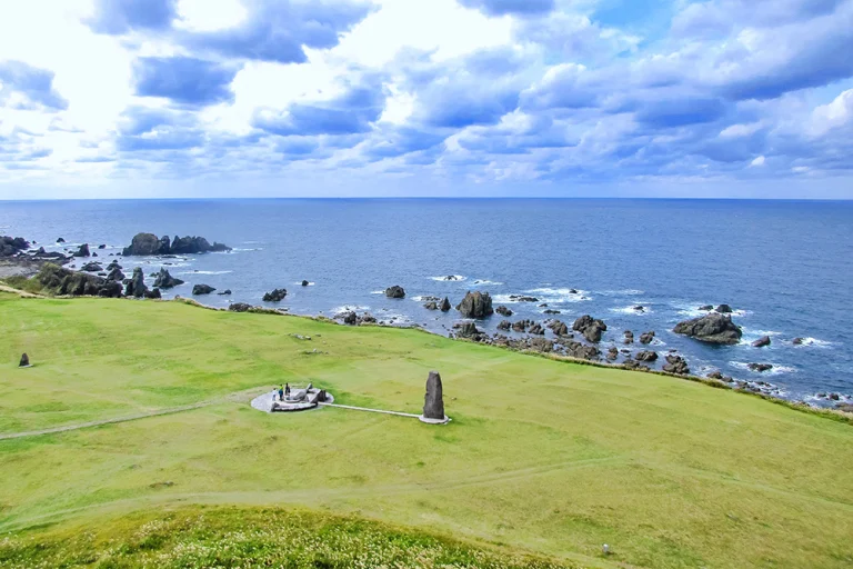 断崖が日本海に落ち込む入道崎は、北緯40度線上の岬。広々とした園地の中に北緯40度線のモニュメントもある。男鹿半島第一の観光地で、白黒2色の入道埼灯台が印象的。この灯台には登ることもできる。