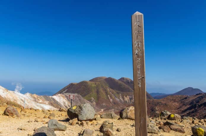 九重山は今もなお活動が続けられている火山群。硫黄山の噴気孔群では、高温のガスが噴出しています。噴火警戒レベルは「1(活火山であることに留意)」ですが、登る前に最新の情報をチェックしてください。