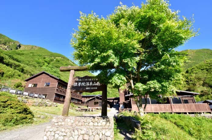 鎌倉時代から続いたお寺が、明治時代に山小屋として生まれ変わった歴史ある施設。源泉かけ流しのお風呂からは大船や平治、立中の3つの山が見える大きな窓があります。売店の品々も充実しているので、補給ポイントとしてもおすすめ。