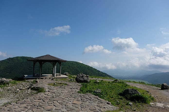 牧ノ戸峠はやまなみハイウェイの最高地点。ドライブやサイクリングの中継地点としても人気で、売店や飲食店、水洗トイレもありますよ。登山道の序盤は舗装された歩きやすい道が続きます。