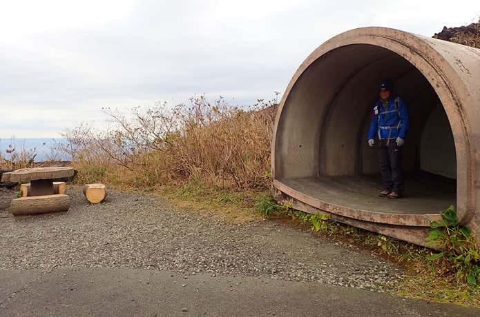 道は次第に九十九折の急こう配へと変わっていきます。遊歩道にはシェルターがいくつも設置されています。