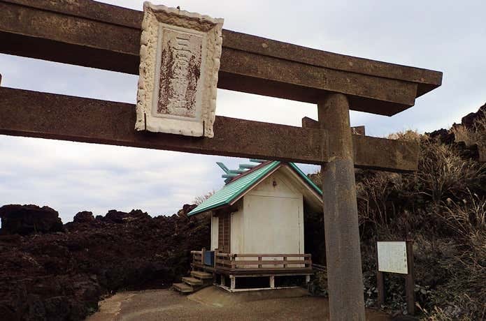 登りきると目に入ってくる三原神社の鳥居。三原神社は鳥居をくぐって少し下ったところにあります。1986年の全島避難となった噴火では、溶岩が直前で神殿を避けて通ったため焼失をまぬがれたという不思議な現象がありました。