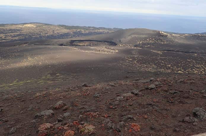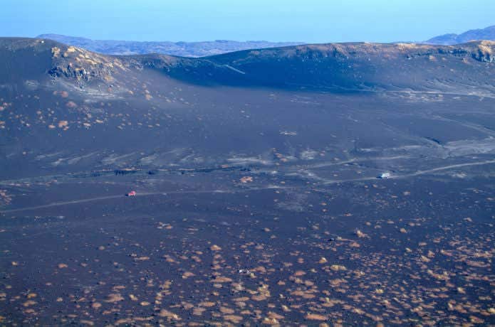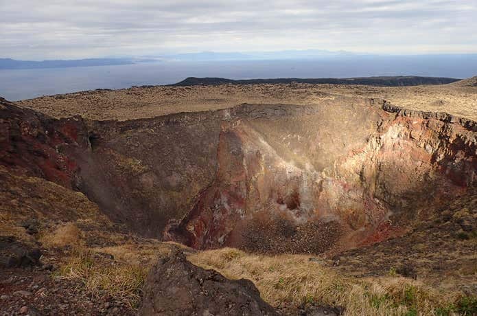 山頂そばでは迫力のある巨大な火口を観察できます。火口の向こう側には水平線、裏砂漠の広大な景色まで見渡せるポイントです。