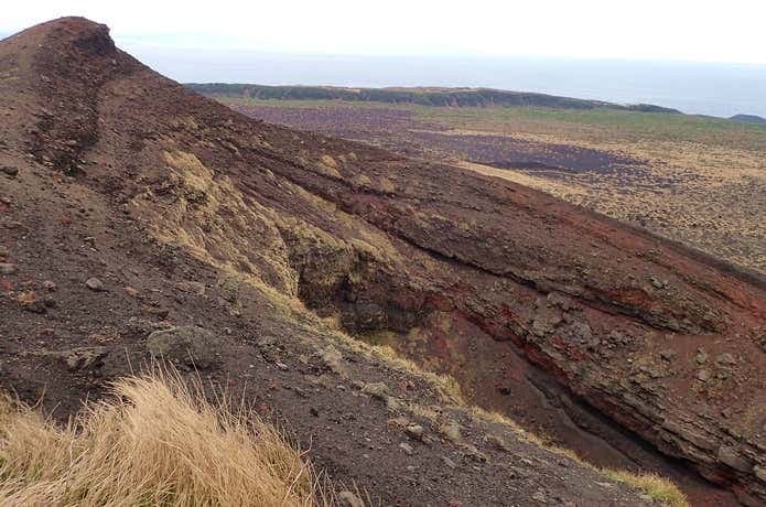 まずは舗装路を歩いて広いカルデラ内部に入っていきます。山腹の黒い筋は溶岩が流れた跡。ごつごつと溶岩が積み重なっている場所もあり、火山であることを感じられます。5月には溶岩の割れ目からたくましく咲いているオオシマツツジが綺麗です。