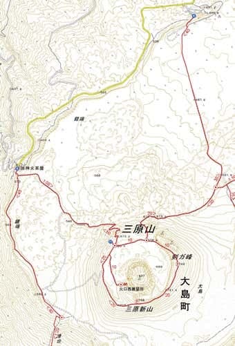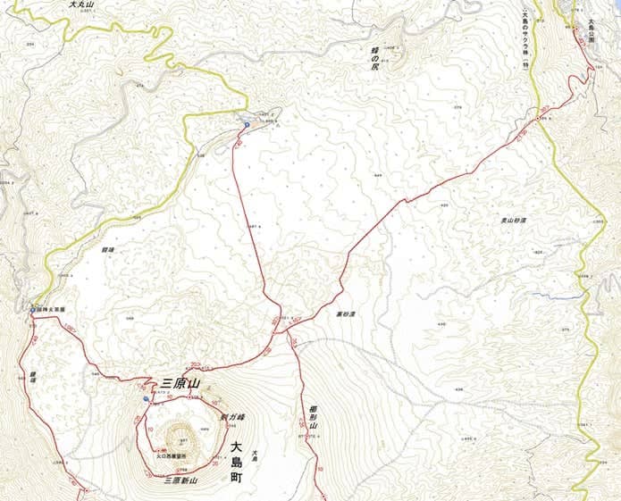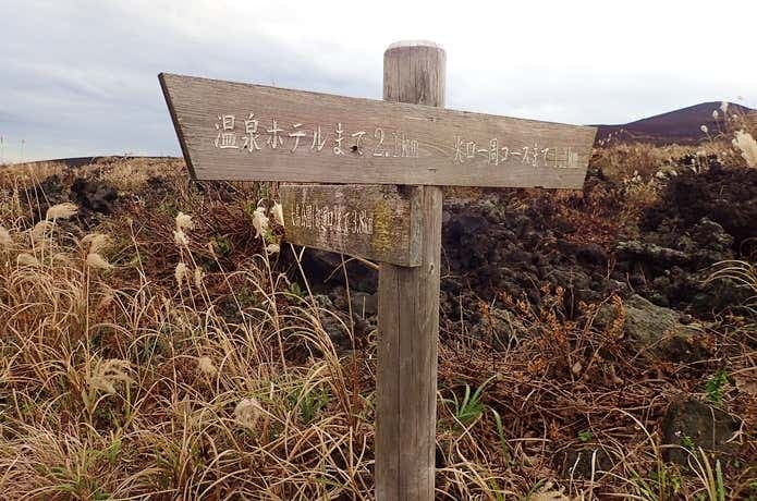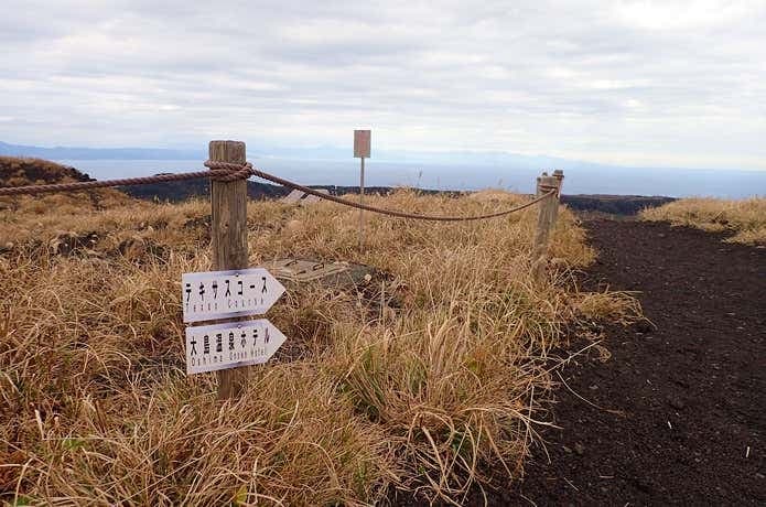 ルート概要 山頂口(御神火茶屋)(60分)→三原山神社(25分)→三原新山(20分)→剣ガ峰(10分)→大島温泉ホテル分岐(20分)→テキサスコース分岐(30分)→大島温泉ホテル