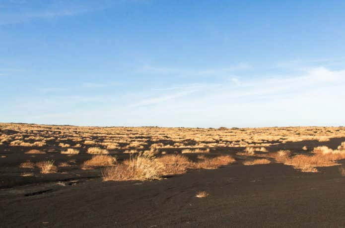 真っ黒で広大な砂漠を歩くと、遮るものがなくただただ広い景色に圧倒されます。だんだん植物が増えていく様も面白いポイントです。