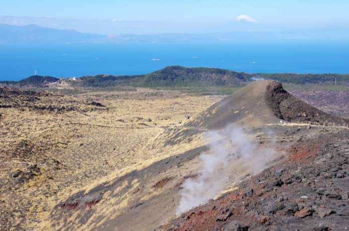 三原山のある伊豆大島は、実は富士山の絶景スポット。晴れていれば裾野まできれいに富士山の姿がとらえられます。三原山に登ると海の向こうには、伊豆の山々や富士山、南アルプスまで見渡すことができます。