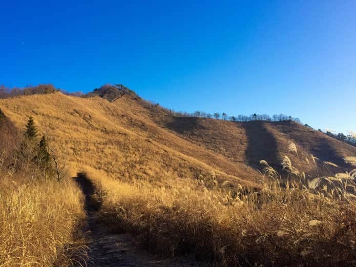 登山道に入ると、じきにススキやカヤなどが山中に生い茂った「カヤト」へ。カヤトからは一気に視界が開け、最初のピークである高座山の山頂が見えてきます。