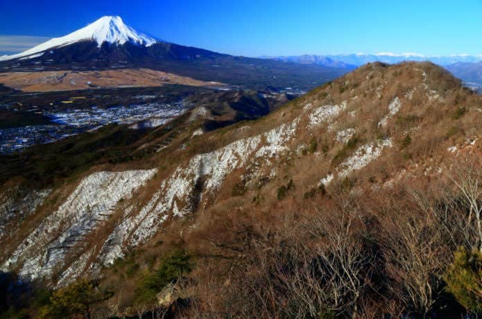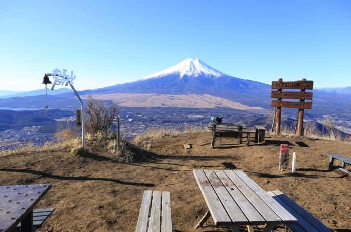 山頂からは、裾を広げた迫力ある富士山をはじめ南アルプスや白峰三山、大菩薩山系など360°の大パノラマを楽しめます。特に、空気の澄んだ冬場は、真っ青な空と冠雪した富士山のコントラストが素晴らしい光景が待っています。さらに、条件が揃えば、眼下に見える山中湖の彼方に相模湾を望むこともできますよ。