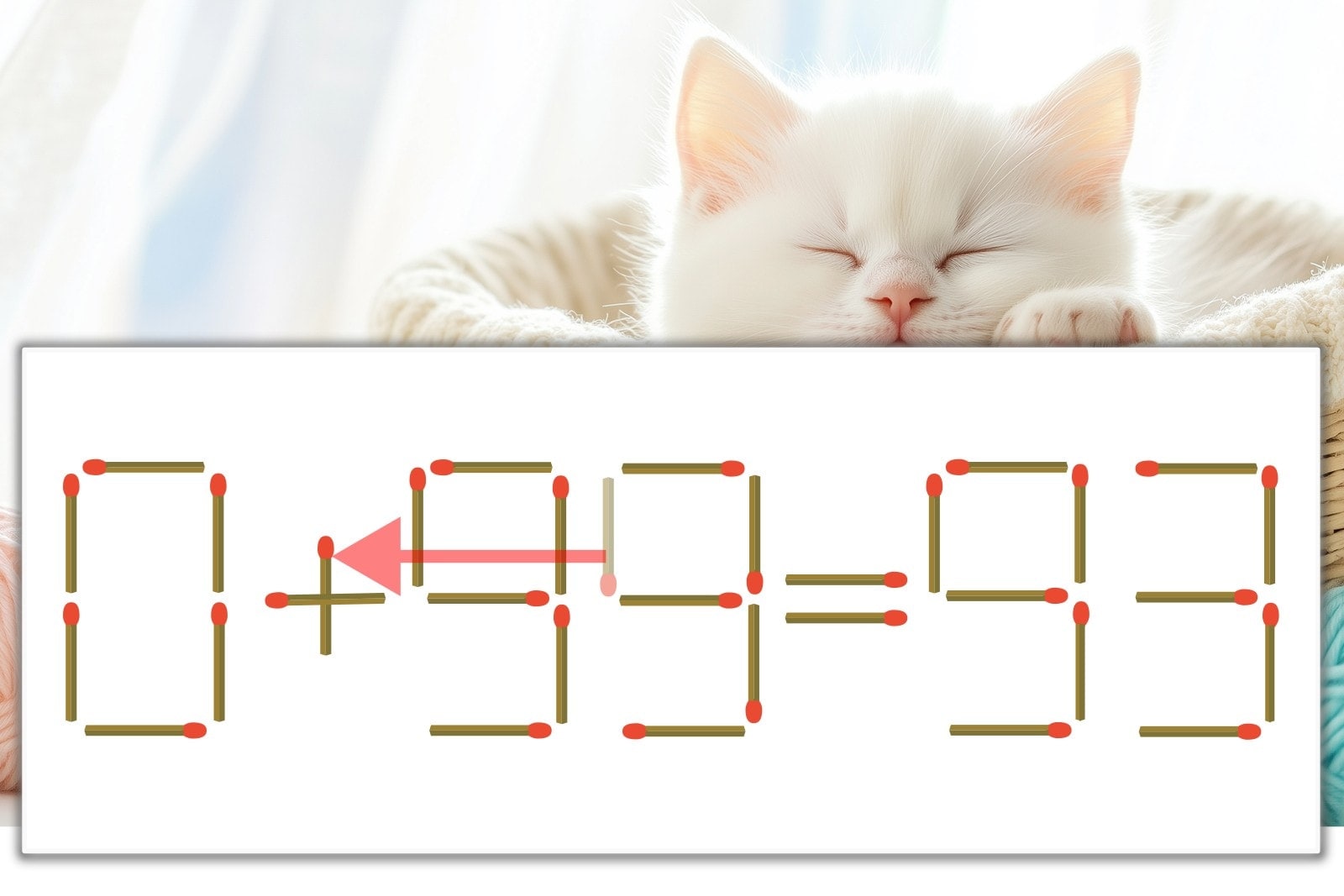 「9」を別の数字に変化させると答えが導き出せます。一の位の「9」のマッチ棒を1本移動して、「-」を「+」にしてみましょう。すると、「0+93=93」が成立します。