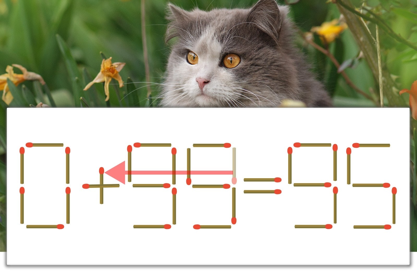 「9」を別の数字に変化させると答えが導き出せます。一の位の「9」のマッチ棒を1本移動して、「-」を「+」にしてみましょう。すると、「0+95=95」が成立します。
