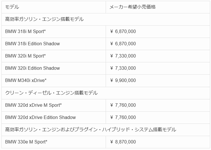 BMW 3シリーズ セダンのメーカー希望小売価格(消費税込み)