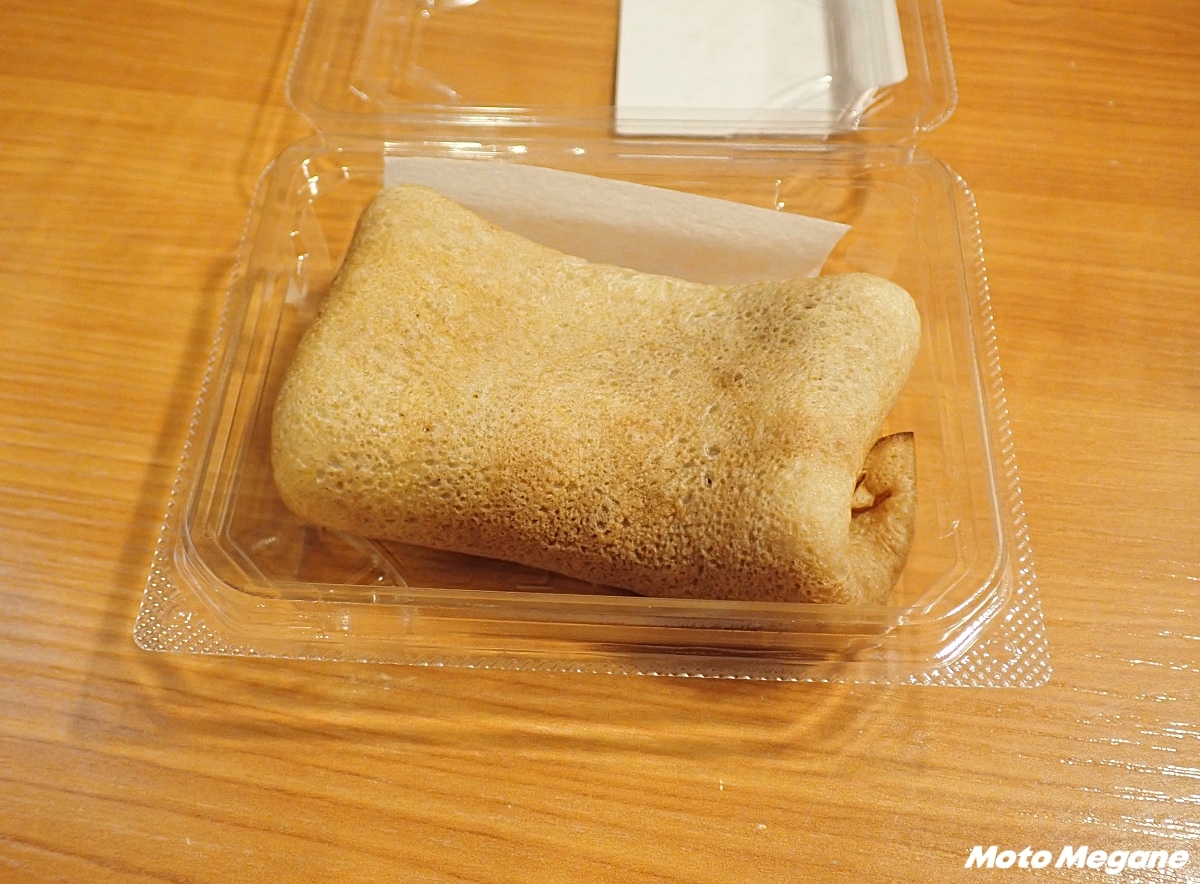 小麦粉を練った生地に具材を加え、鉄板で香ばしく焼き上げる素朴な郷土おやつ。外はこんがり、中はもっちりとした食感が特徴で、家庭や地域ごとに味や具材が異なる。道の駅の菓子工房でも作られており、出来たての温かいものが店頭に並ぶ。モチモチのクレープ風生地の中に黒砂糖が入っている。素朴な味わい。