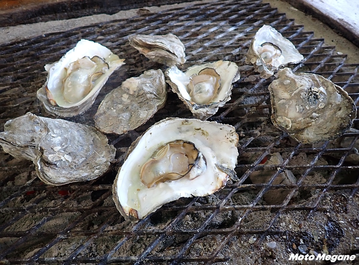 ガタッコハウスは冬季はカキ小屋が営業。地元産の牡蠣やヒオウギ貝、サザエなどの貝類を自分で炭火で焼いて味わえる。貝類のほかにも、魚介類や肉類を使ったBBQメニュー、うどんなども注文可能だ。