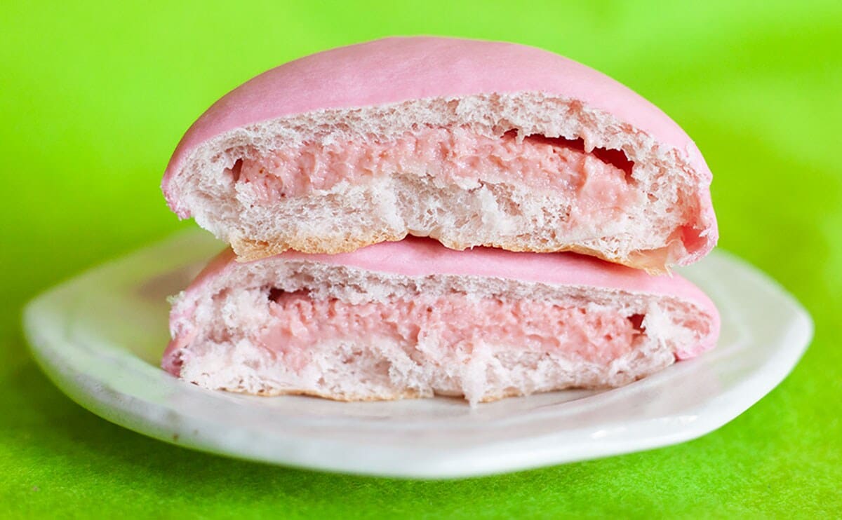 この商品のベースとなるのは、いちご果肉入りのクリームを包んだパン。そのうえに、もちっとした食感の生地をのせて焼き上げたのだとか。名前はどうだったか覚えていませんが、ファミリーマートでは以前から、このタイプのパンを販売していますよね。