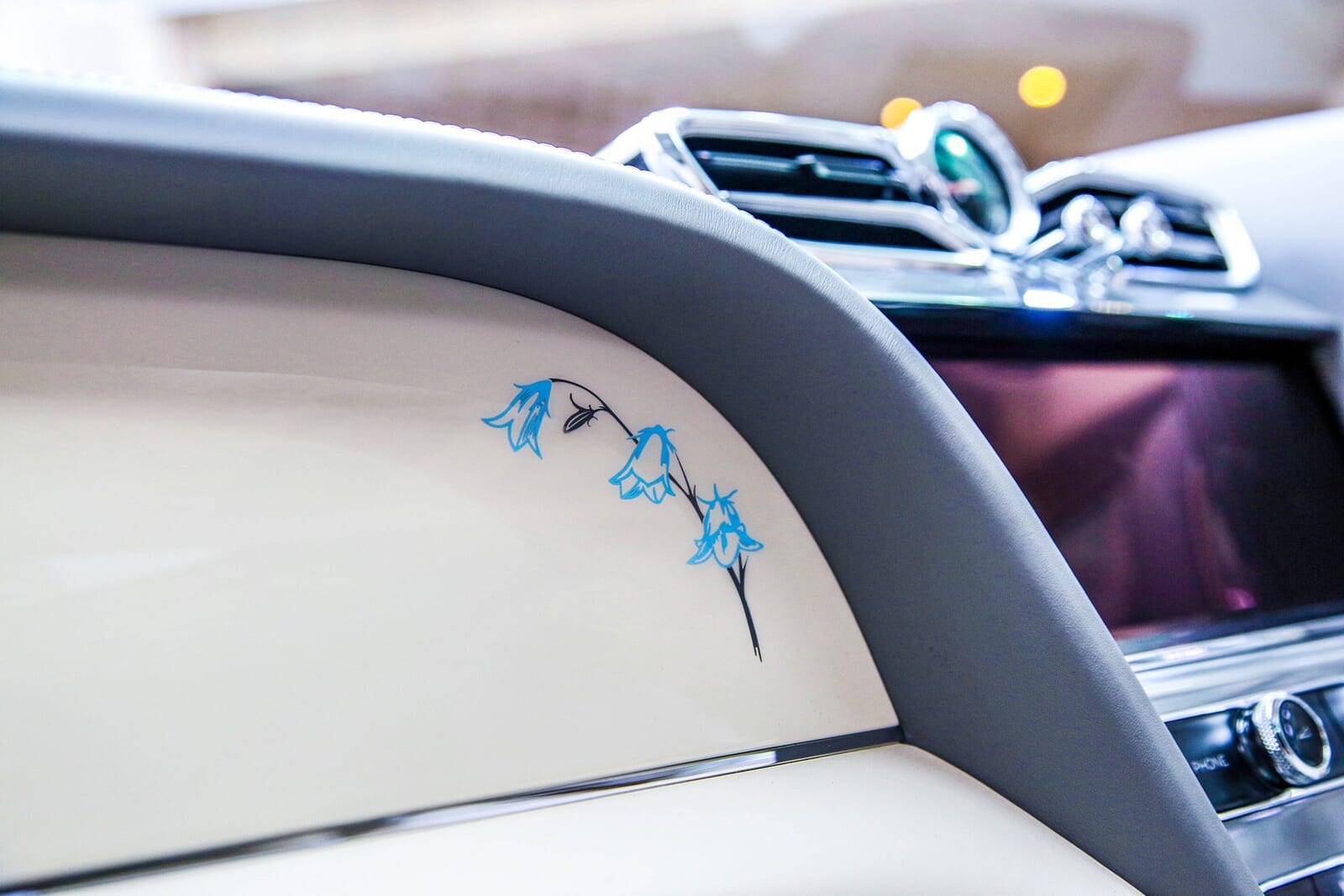 「リネン」と名付けられたクリーム色のレザーに、「グラビティグレイ」の引き締め役。そして、助手席のフェイシアには「ツリガネズイセン(ブルーベル)」の花のモチーフが描かれている。花言葉は「変わらぬ愛」。