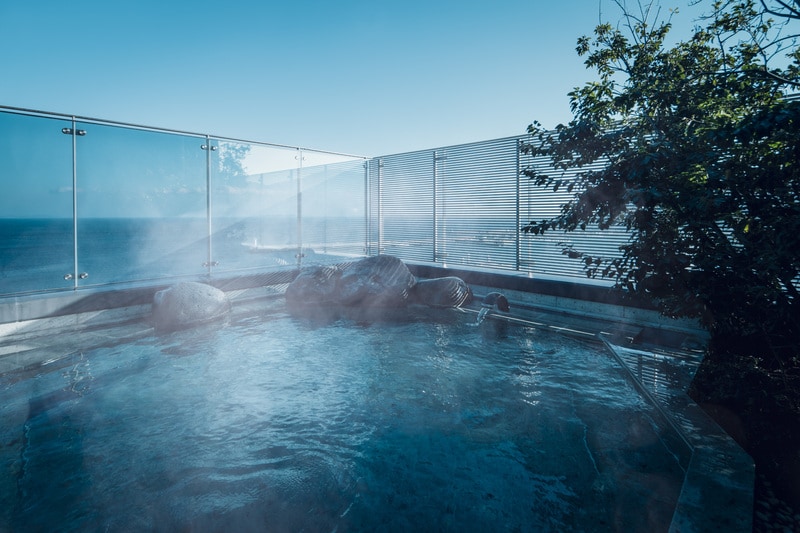 オープンバスで春風を浴びた後は、ツアー参加者限定の特典「はしご湯」で体を温めるのがおすすめです。モダンな船旅をイメージした「界 アンジン」の海を望む大浴場と、毎分600リットルの豊富な湯量を誇る「界 伊東」の庭園美あふれる大浴場。
