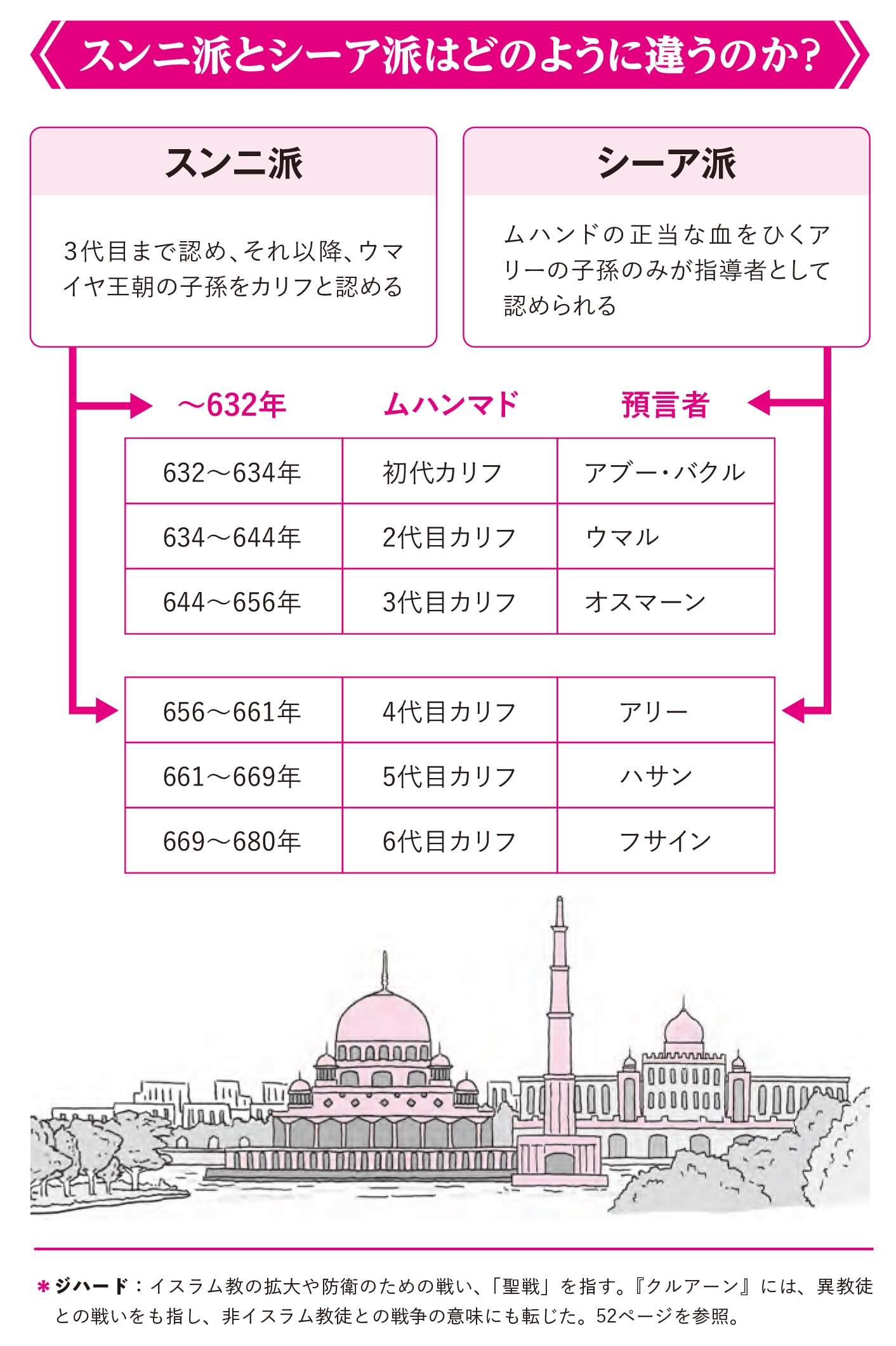 アリーの死をきっかけに、イスラム社会にスンニ派とシーアという大きな二つの流れが生まれました。スンニ派は、イスラム教徒の約8割を占めます。3代までをカリフと認め、その後はウマイヤ朝の子孫をカリフとします。シーア派は、アリーの子孫だけが指導者だと考えます。