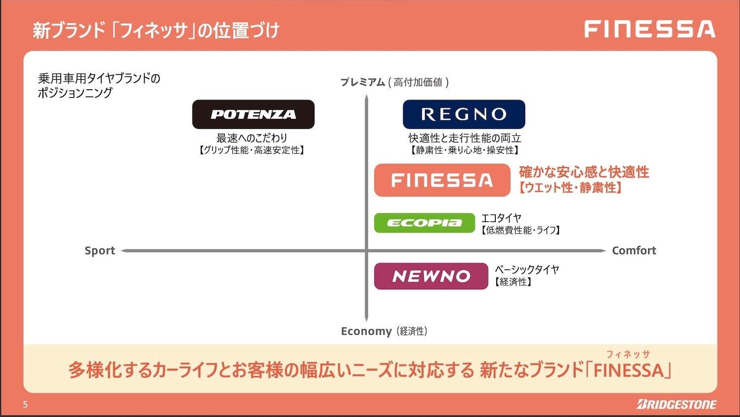 ブリヂストンにはエントリーモデルにNEWMO(ニューモ)や燃費に効くECOPIA(エコピア)、そして乗り心地やハンドリングを格上げするPLAYZ(プレイズ)といったタイヤがラインアップしているが、どうやら、このフィネッサはプレイズの後継に位置付けているのだろう。