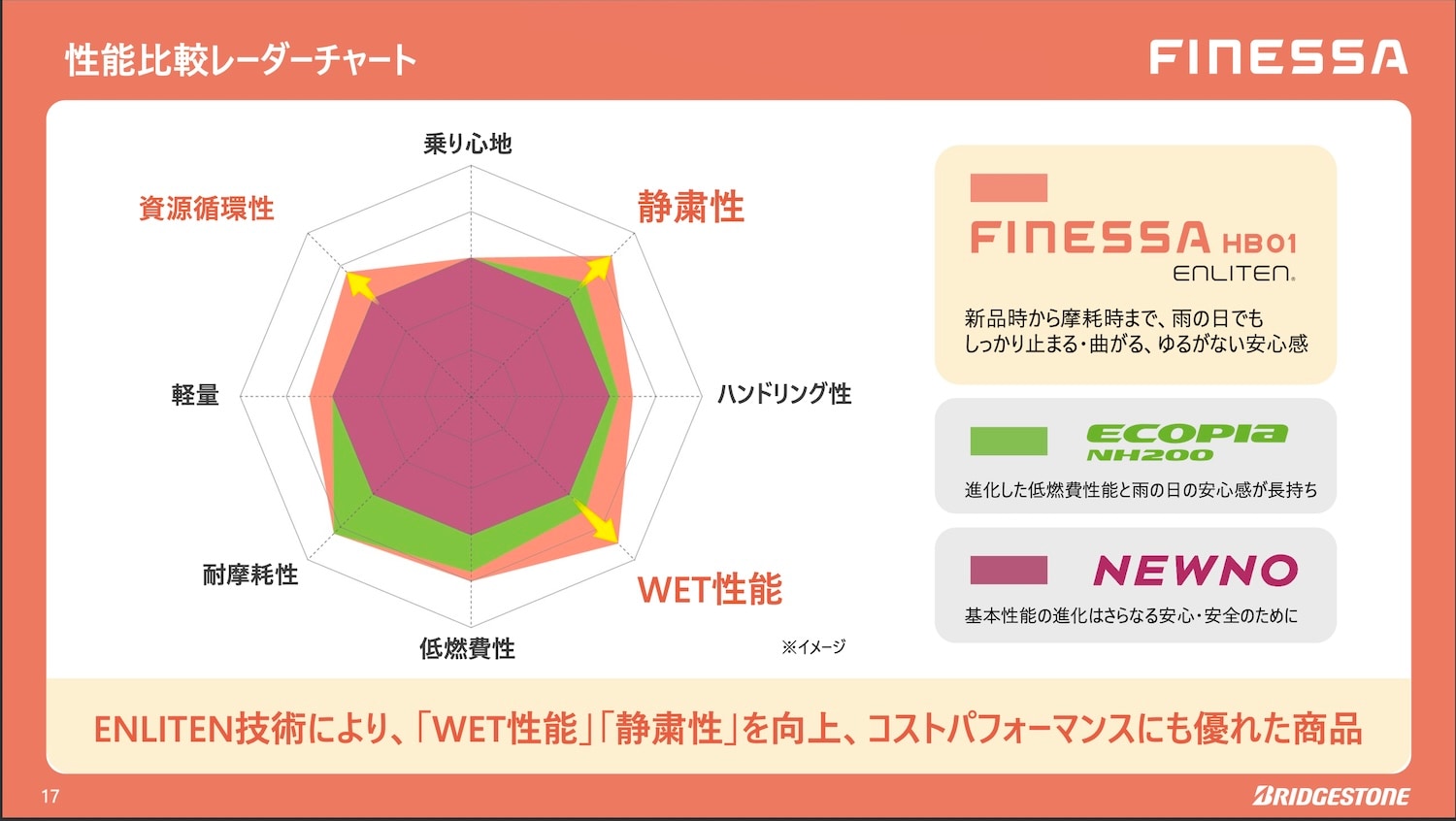 総合性能ではブリヂストンのスタンダードタイヤにはニューモとエコピアがあり、新規にこのフィネッサHB01が加わったが、資源循環性も含め、すべての評価領域でフィネッサHB01がもっとも高性能なタイヤということができ、コストパフォーマンスではワンランク上の新商品ということができるだろう。