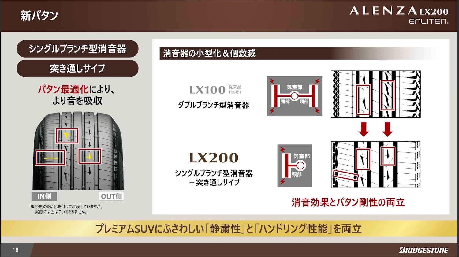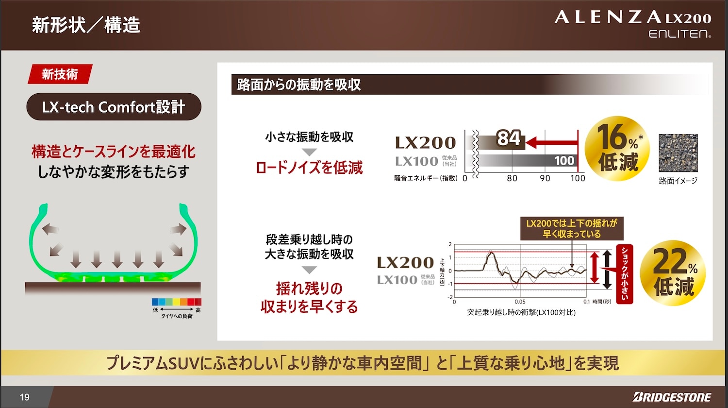 ブリヂストンのSUV向けプレミアム・コンフォートタイヤ「アレンザ」の第2世代がデビューした。初代のアレンザLX100の後継モデル「アレンザLX200」は、ブリヂストンのタイヤ基盤技術であるENLITEN(エンライトン)をベースに、より上質な乗り心地や静粛性を高めて登場した。 そのアレンザLX200をテストする環境があったのでお伝えしよう。まずは専用のテストコースで、車両のふらつきや、応答性、リヤの追従性、揺れや振動の収束、そして直進安定性をみることができるコースで試乗した。車両はレクサスNX350hとハリアーを使ってLX100との違いも体験することができた。 SUV用プレミアムコンフォートタイヤ「アレンザLX200」 コースでは40km/hのスラローム、60km/hでのレーンチェンジでハンドリングの違いを体験。LX100に対し新商品のLX200では滑らかさとしなやかさが全然違うことを感じる。後に開発エンジニアに聞けば、キビキビした性能ではなく、しなやかさ、素直さ、そしてスムースに走ることを狙って開発しており、キビキビした性能であればアレンザ001というスポーツ系のタイヤがあると説明していた。 次に乗り心地 […]
