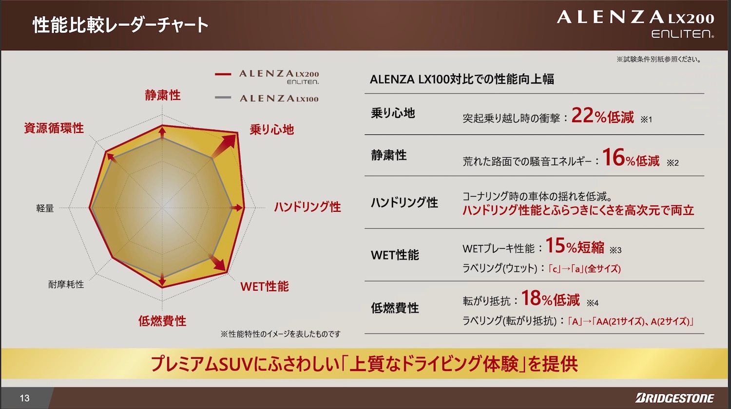 ブリヂストンのSUV向けプレミアム・コンフォートタイヤ「アレンザ」の第2世代がデビューした。初代のアレンザLX100の後継モデル「アレンザLX200」は、ブリヂストンのタイヤ基盤技術であるENLITEN(エンライトン)をベースに、より上質な乗り心地や静粛性を高めて登場した。