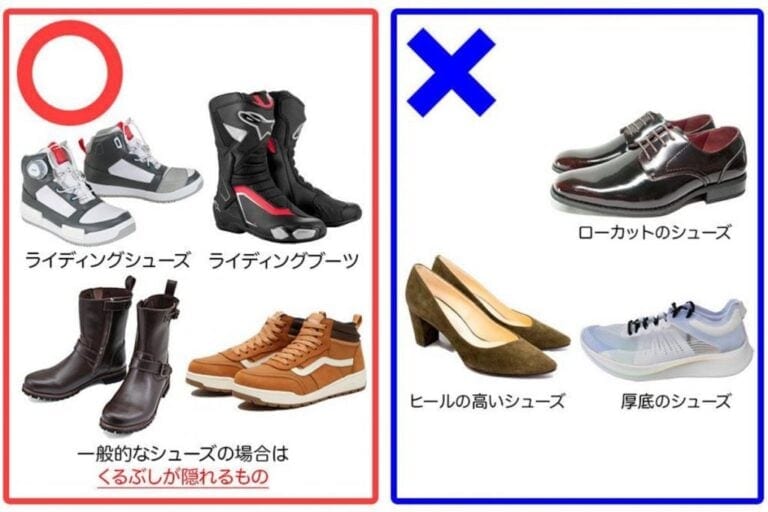 技能教習で使用可能なシューズは、くるぶしまで覆っているハイカットタイプのものが基本です。ライディングブーツやライディングシューズなら問題ありません。くるぶしまで覆われていても、厚みや丈夫さに欠ける仕様のシューズも好ましくありません。足そのものや足首をしっかり守ってくれるシューズを選びましょう。