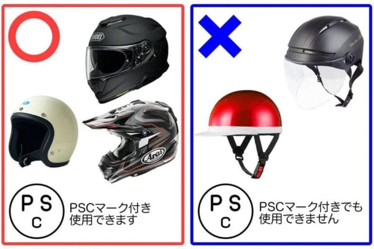 コロナ禍の影響から、現在はほとんどの教習所ではヘルメットの貸し出しが行われていないため、ヘルメットは自身で購入したものを持参してください。上記画像はレインボーモータースクール 和光で定められている一例ですが、多くの教習所が同様の設定となっています。消費生活用製品安全法という法律に基づいて製品の安全性を消費者に保証するPSC(Product Safety of Consumer Productsの略)マークが付いているヘルメット製品が前提で、PSCマークが付いていてもハーフヘルメットや自転車用ヘルメットなどは技能教習に利用できません。「自分が持っているヘルメットが教習に向いているかどうか判断できない」という方は、事前に通う予定の教習所に確認しましょう。