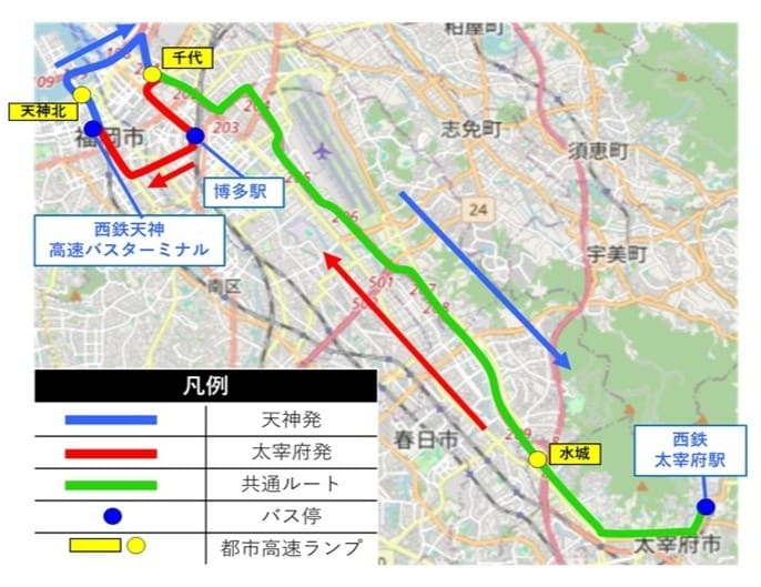 太宰府発:西鉄太宰府駅⇒水城ランプ⇒(都市高速)⇒千代ランプ⇒博多駅前(降車専用)⇒西鉄天神高速バスターミナル