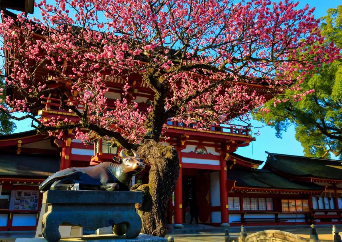 学問の神様・菅原道真公を祀る全国天満宮の総本宮。御本殿(重要文化財)や、道真公を慕って都から飛んできた伝説を持つ御神木「飛梅(とびうめ)」は必見です。境内には約200品種6,000本の梅が植えられており、四季折々の表情を見せます。