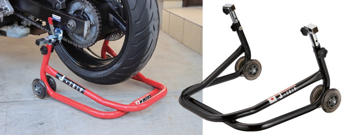 まずは作業性を高めるアイテムとして、「メンテナンススタンド」が有効だ。タイヤ回転や足回り点検が安定した姿勢で行え、チェーンのメンテナンスやホイールの清掃などを効率的に行うことができる。