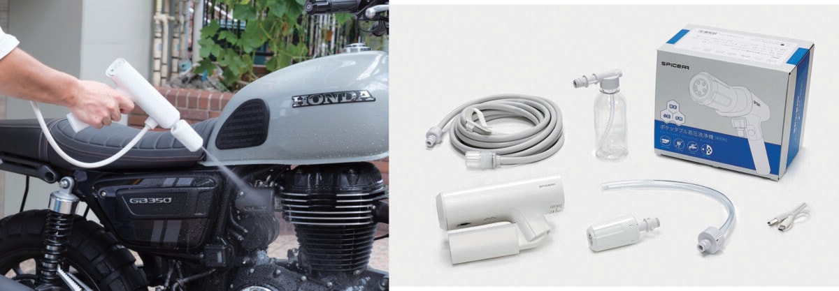 サイン・ハウスのSPICERRブランドから発売された軽量・コンパクトな充電式高圧洗浄機で、電源や水道がない場所でもペットボトルやバケツから給水でき、バイク洗車から日常のちょっとした汚れ落としまで幅広く使えるのが特徴。折りたたむとポケットに入るサイズになり、800gの軽量設計で女性でも扱いやすく、圧力は3段階、噴射パターンは5種類(計15通り)に調整可能だ。静音設計でマンションでも使いやすい。