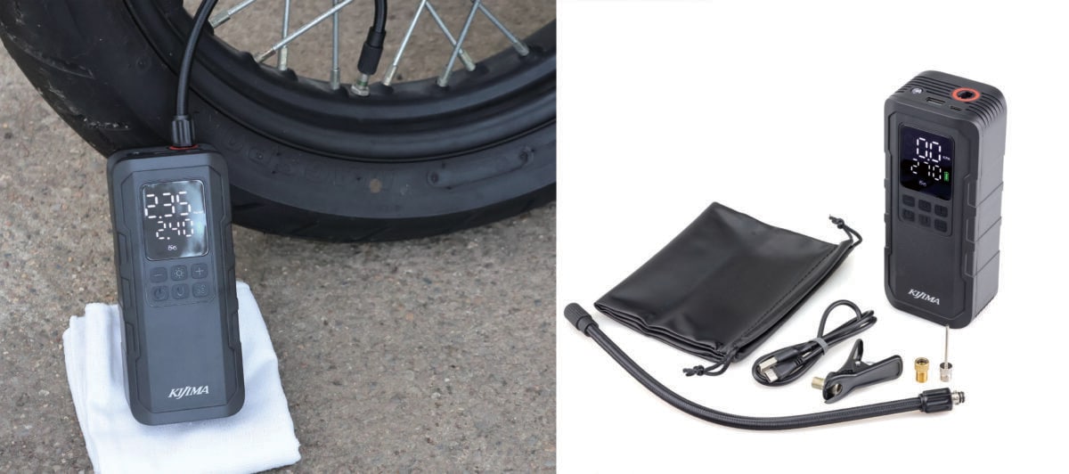 キジマがリリースした充電式電動空気入れ。バイクはもちろんのこと、自動車、自転車、ボールなど様々なバルブに対応し、設定した空気圧で自動停止する便利な製品だ。前モデル(JP02)から充填速度が大幅に向上(1.3〜1.5倍)し、モバイルバッテリー機能も追加された進化版で、Type-C充電、LEDライト、4種の圧力単位表示(PSI, BAR, KPA, kg/cm2)、クイック式ホースなどが特徴となっている。