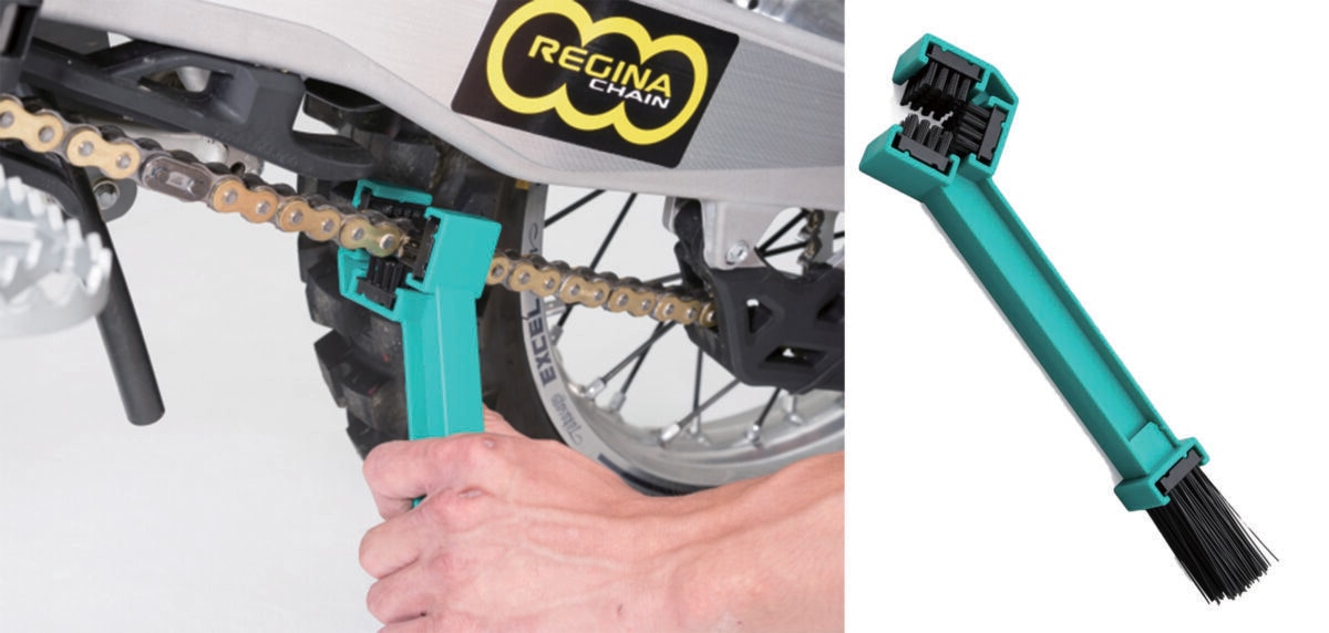 チェーンクリーニングの必需品と言えるのがこのブラシ。一度に3面洗浄できる3面ブラシと、より細かな汚れ落としに便利なロングブラシのコンビネーションとなっている。これを使えばチェーン清掃の時短は間違いなくできるはずだ。