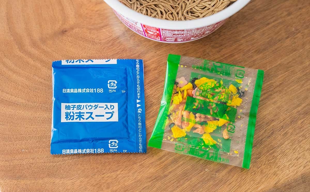 カップの中には、麺と一緒に「柚子皮パウダー入り粉末スープ」と「かやく」の袋が入っています。