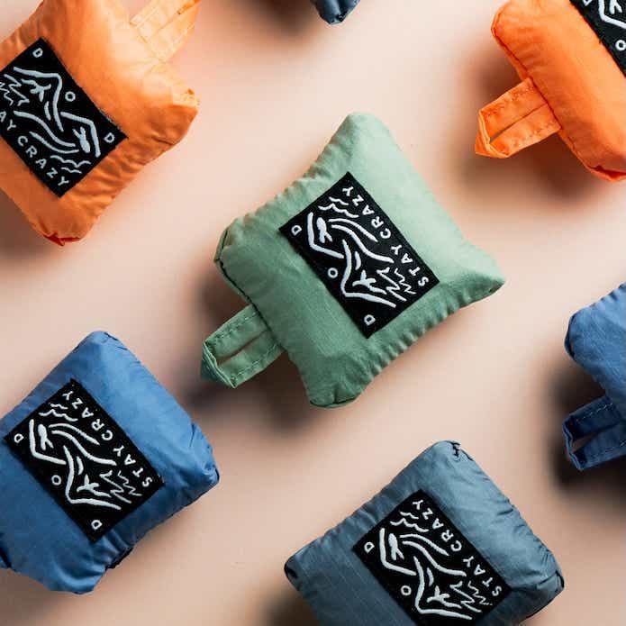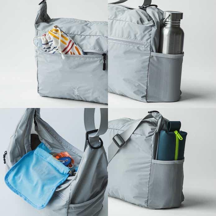 それぞれ、バッグに縫い付けられたポケットに、本体をクシャッと丸めて収納できるポケッタブル仕様です。