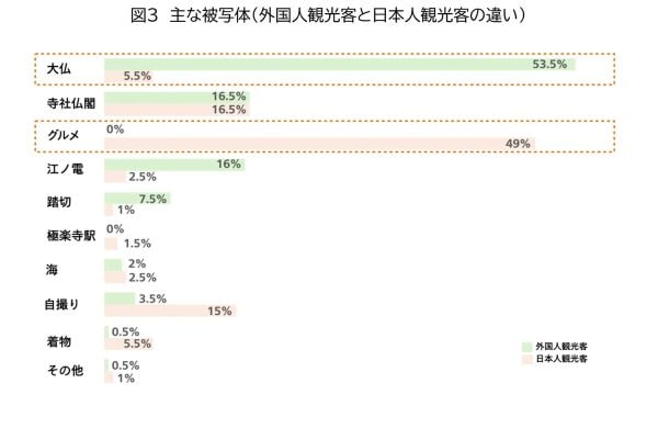 調査では、鎌倉を観光で訪れた人のインスタグラムの投稿(#鎌倉、#kamakuraで上位表示されたもの)の画像の特徴を分析した。外国人観光客200人(欧米豪:100人、アジア100人)、日本人観光客200人が対象で、調査時期は2025年9〜11月。
