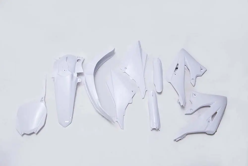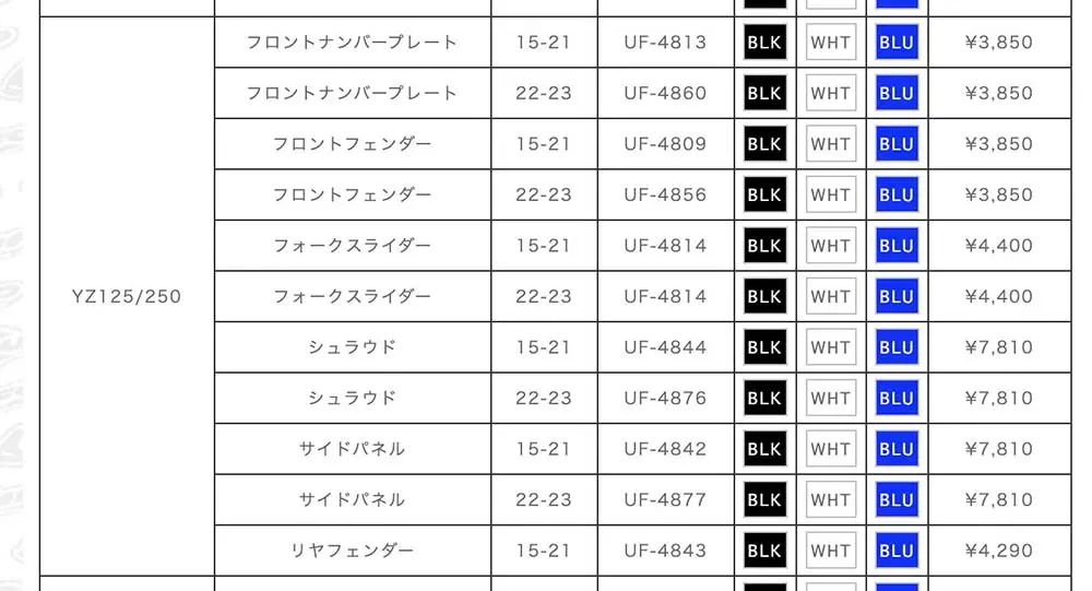 UFO PLASTの外装キットを調べてみると、現在日本で手に入るのは黒、白、青の3種類。全身ブラックはFASTHOUSEのウエアの雰囲気とかにマッチしそうです。青でヤマハ純正らしさをアピールするのもいい。あとは白……。白ってそういえば昔のYZで使われてた色じゃないですか。