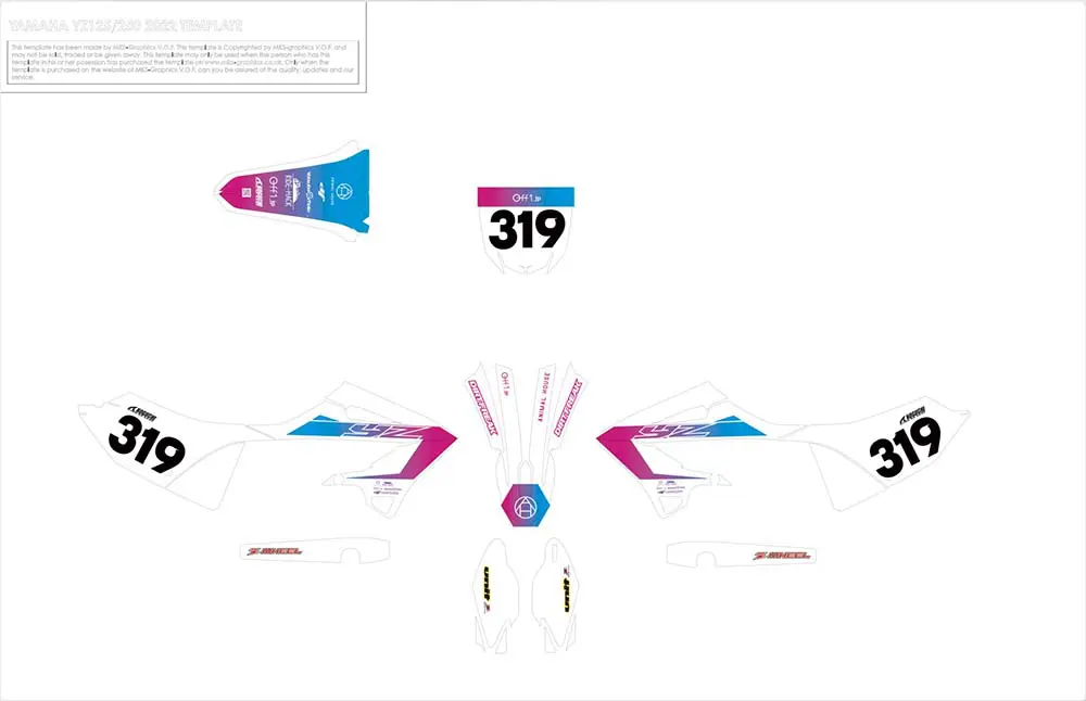 デカールのデータ制作はadobeのイラストレーターを使って作ります。YZM250はシンプルに“YZM”と文字が入っているだけなので、今風にアレンジ。ピンク→スカイブルーのグラデーションを、2023年式YZシリーズのグラフィックを参考にレイアウトしています。