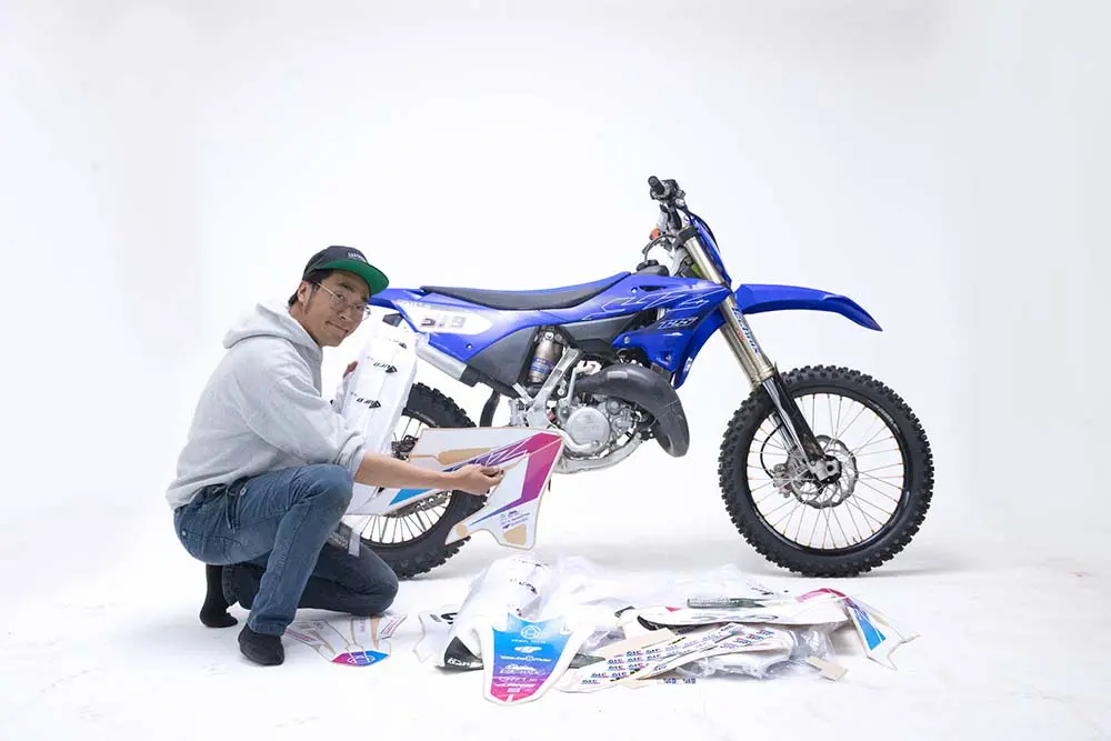 そこで思い立ったのは、外装をすべてリフレッシュしてみようという計画。せっかく全外装を変更するならオリジナルの外装を仕立ててみたい、というわけです。ここ数年YZ125はタンクの色が黒なので、青い外装を他の色で統一することもできちゃいますね。