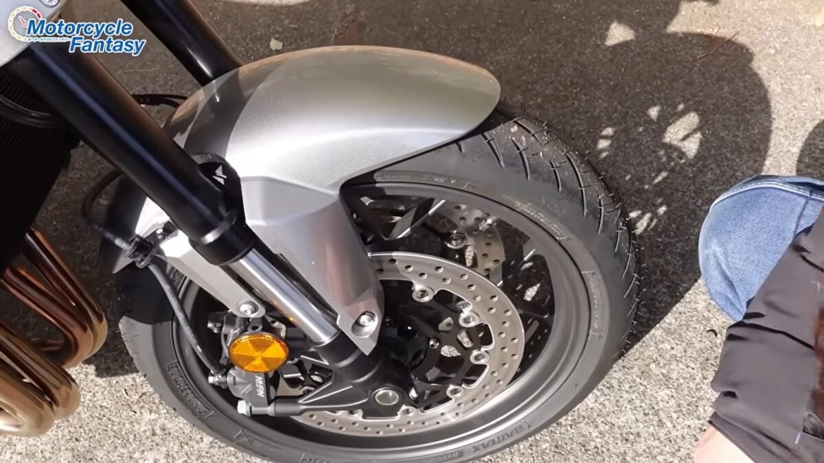 310mmダブルディスクにラジアルマウント4ピストンNISSIN製キャリパー、そしてコーナリングABSなど安全性もしっかり考慮。止まる時に「怖さ」より「信頼感」が先に来るブレーキフィールがCBブランドらしい。