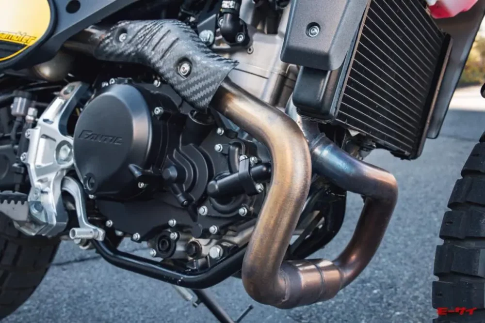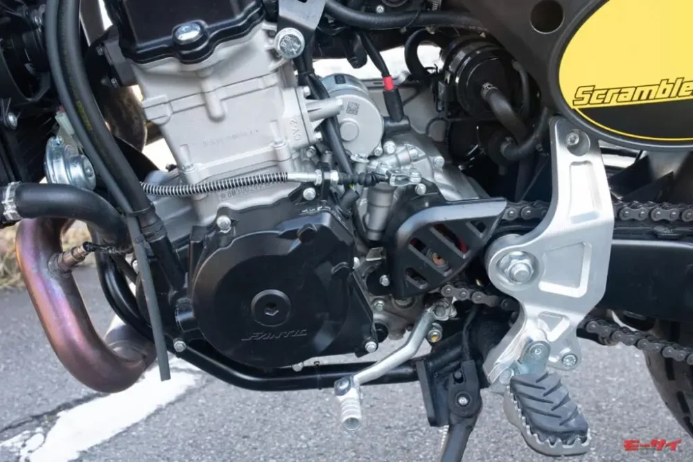種類:水冷4ストローク単気筒DOHC4バルブ ボア×ストローク:94.5mm×64mm 総排気量:449cc 最高出力:40HP/7500rpm 最大トルク:43.0Nm/6000rpm 変速機:6段リターン