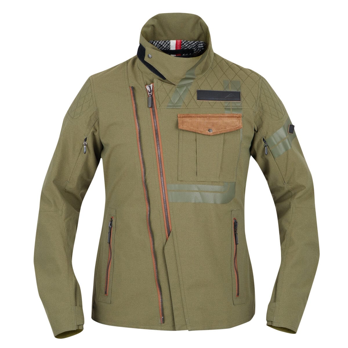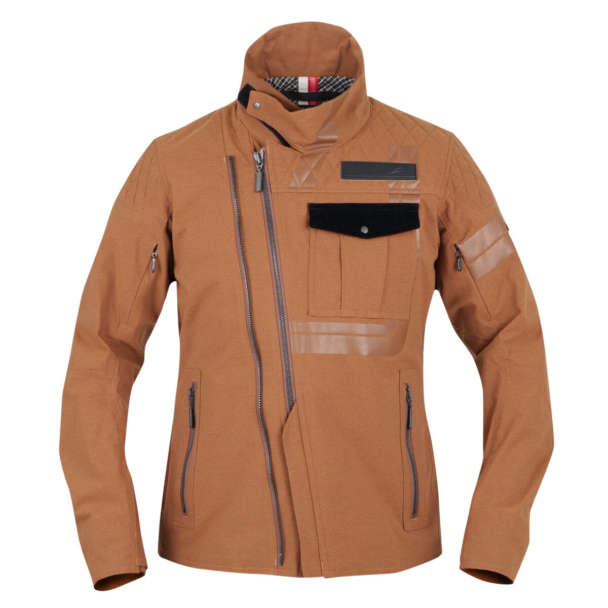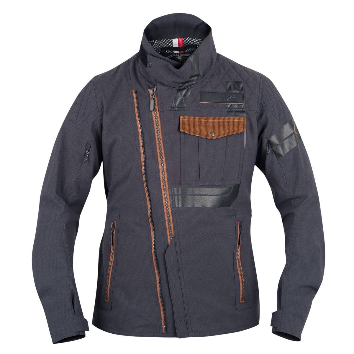 ダブルの斜めフロントファスナーとダイヤ柄パテッドデザインを採用したジャケットです。ダイヤ柄リップと杢調を品良く融合させ、ストレッチ機能を持たせた防水透湿生地を独自開発し採用しています。各ファスナーの8番仕様やトラディショナルイメージのラインプリント、後ろベンツの採用で、オーセンティックイメージの具現化に寄与しています。「KUSHITANI CONNECTION」採用。