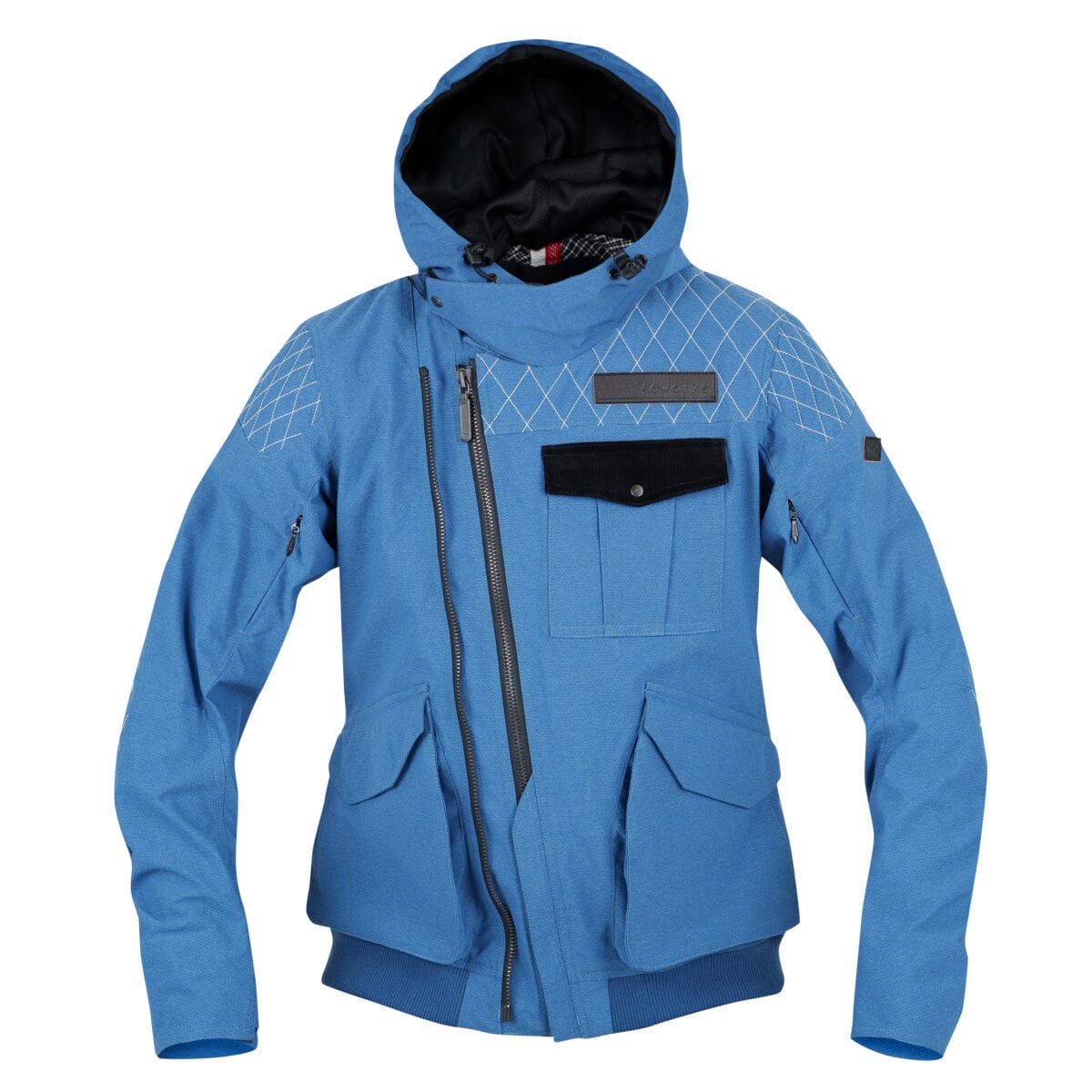 ダブルの斜めフロントファスナーとダイヤ柄パテッドデザインを採用した46worksフードジャケットです。ダイヤ柄リップと杢調を品良く融合させ、ストレッチ機能を持たせた独自開発の防水透湿生地を採用しています。「KUSHITANI CONNECTION」採用。