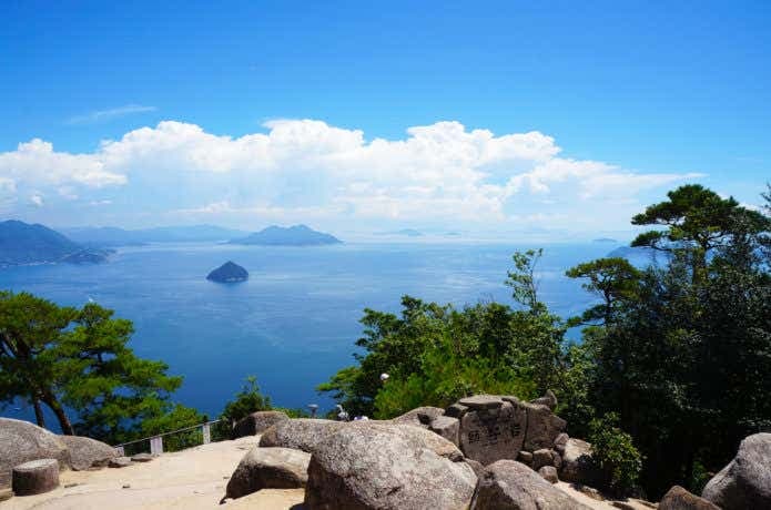 紅葉谷駅からロープウェイを乗り継いで獅子岩駅へ。ここから山頂までは徒歩で30分ほどですが、いったん下って登るため歩きやすいスニーカーなどで行くのがおすすめ。山頂は360℃視界を遮るものがなく、瀬戸内海や遠くは四国連山まで見渡せる絶景を眺めることができます。