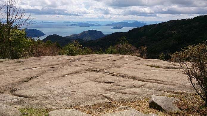 野呂山はマグマが噴出してできた流紋岩が隆起した山で、その後色々な割れ目が入ることで奇岩がたくさんある山です。このコースでは、角ばった大きな岩に覆われた岩海やかぶと岩、大滑岩と呼ばれる一枚の大きな岩など見どころがたくさん!山頂にある展望台は瀬戸内海の美しい景色を見る絶好のスポットです。