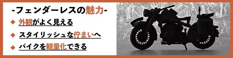 見た目だけでなくフェンダーレス化により、バイクを軽量化できるのもメリットです。